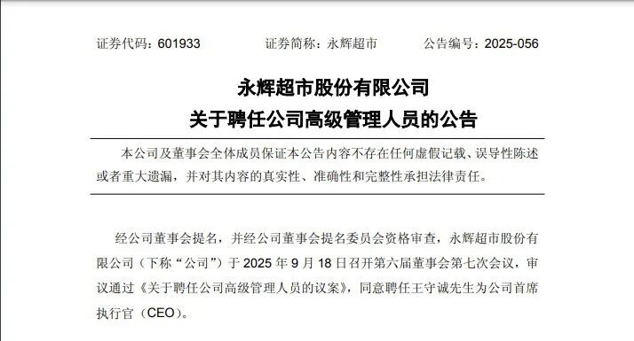 永辉超市9月19日发布公告称,公司第六届董事会第七次会议审议通过相关议案,聘任王守诚为公司首席执行官。
