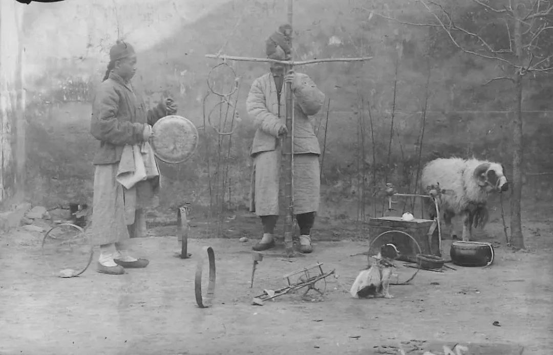 耍猴儿最是百看不厌。艺人们用独轮车推着道具箱,带着猴子、巴儿狗、山(绵)羊等动物,选好空地,敲锣打鼓吸引观众。