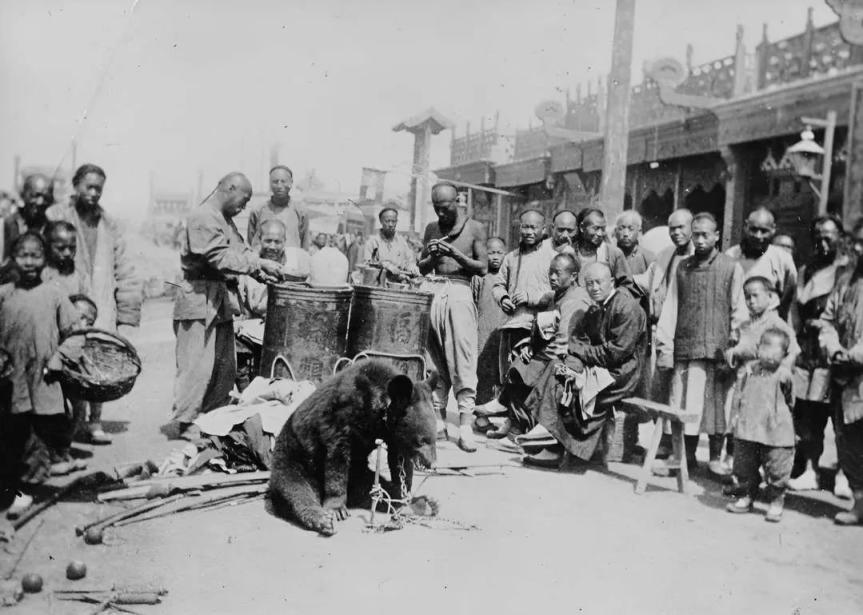 在耍狗熊这个领域,清末民初艺人程福先无疑是优秀代表。程福先籍贯直隶吴桥,传承了家族技艺,他驯养的狗熊能表演十几种玩艺儿,人们看了称奇,送其绰号“狗熊程”,并把他列为“天桥八大怪”之一。
